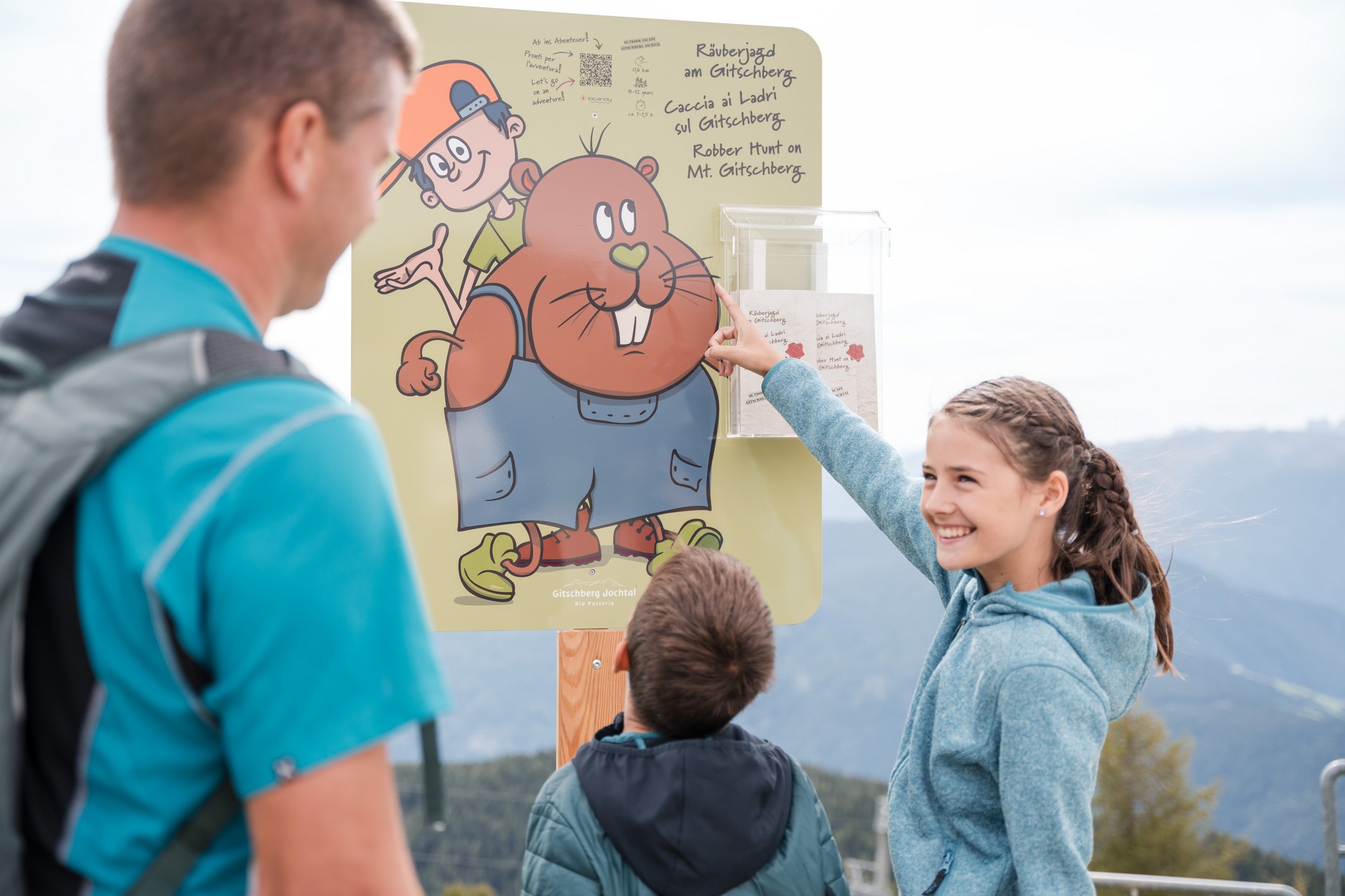 Il punto di partenza consigliato è presso la stazione a valle Gitschberg, dove riceverete una mappa del tesoro gratuita e potrete scaricare l’app Locandy necessaria per giocare. Da lì potrete prendere la funivia e salire alla stazione a monte Nesselbahn, dove la Caccia ai Ladri entrerà nel vivo sulla via che porta al rifugio Gitschhütte.