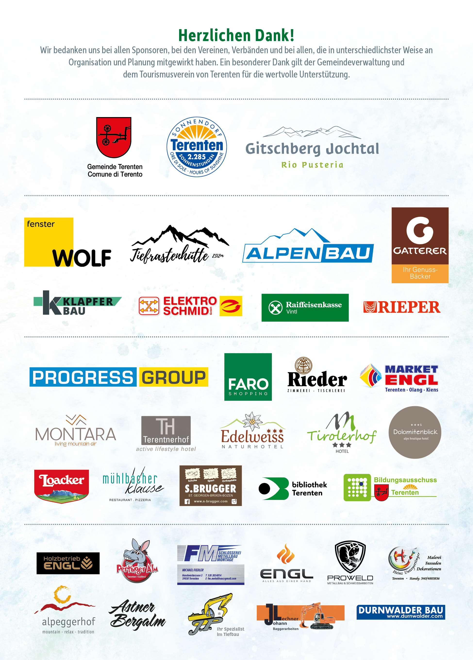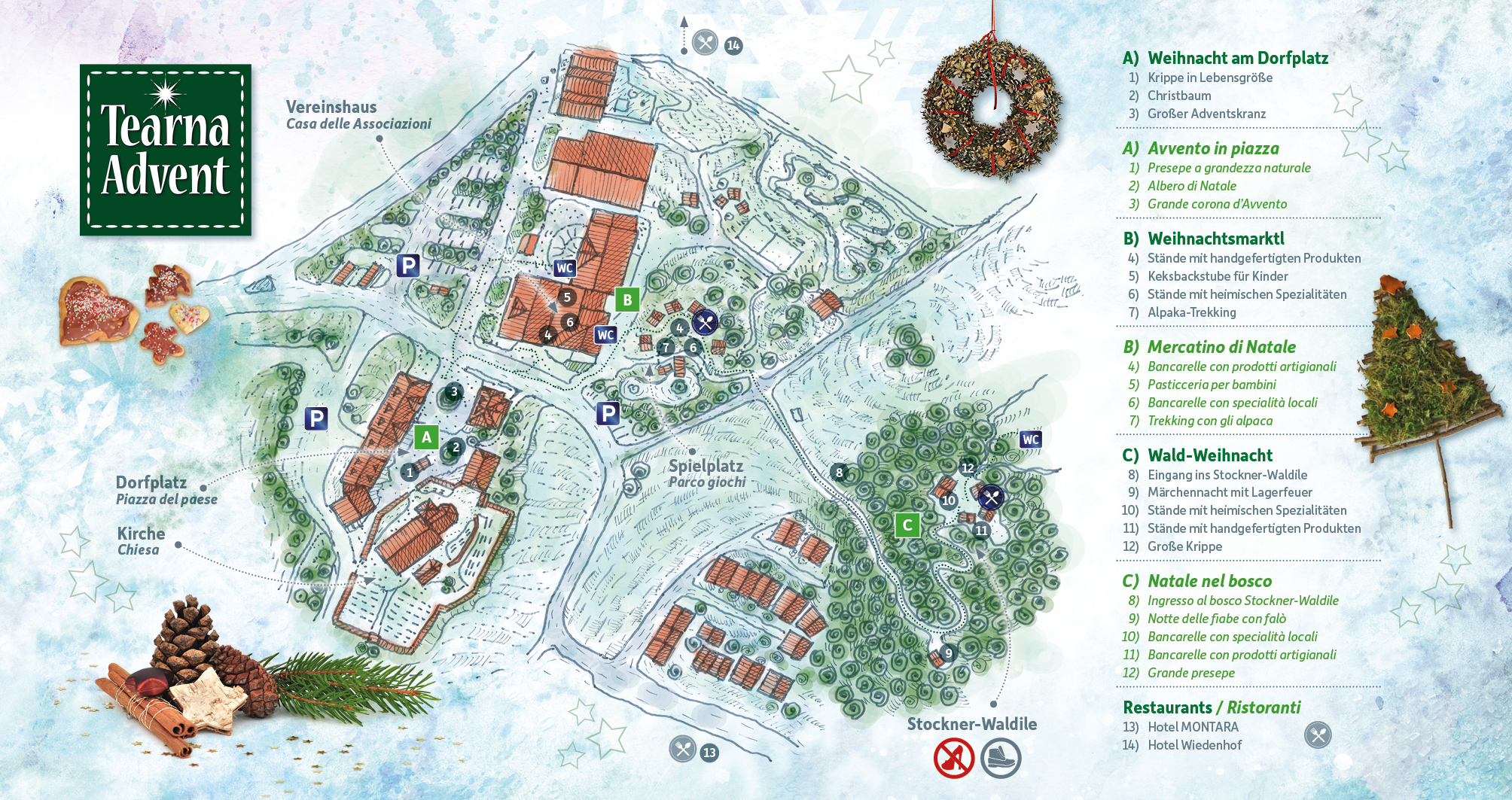 Con la manifestazione „Tearna Advent- l’Avvento di Terento” desideriamo avvicinare la cultura e le tradizioni contadine del Natale ai bambini, alle famiglie e agli ospiti. Dal paese addobbato come vuole la tradizione, la strada porta alla casa della comunità dove potete anche cuocere i biscotti. Dopodiché si prosegue fino alla mostra dei presepi ed al Mercatino di Natale. All’altezza del parco giochi troverete molti oggetti fatti a mano ed un minizoo dedicato ai più piccini.